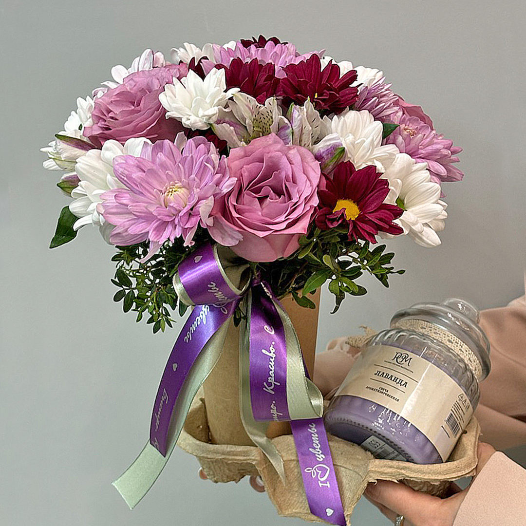 Такой сет подойдёт для поздравления с днём рождения, годовщиной или в качестве внимания близкому человеку. Компактный формат и тёплые тона делают его уместным как для домашнего интерьера, так и для рабочего стола. А сочетание цветов и свечи создаёт особое настроение, превращая момент вручения в маленький праздник.